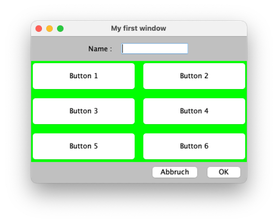 JPanel mitteist imGridLayoutmit 3 Zeilen und 2 Spalten. Diesem Panel werden 6JButtonzugeordnet. Die Buttons haben einen vertikalen und horizontalen Abstand von jeweils 10 Pixeln (zwischen den Buttons ist der Abstand also 20). Beachten Sie, dass die Größe der Buttons an die Fenstergröße angepasst sind. Mit wachsender Fenstergröße wachsen auch die Button-Größen. Dem Panel wurde die HintergrundfarbeGREENzugewiesen. - Das